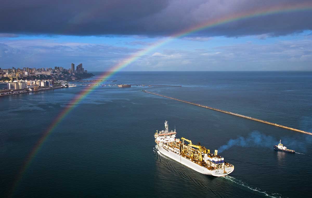 Está vendo aquela outra foto, daquele navio, lá, perto da porta? [“Navio Entrando no Porto de Salvador”. Abaixo]. Pois bem, considero aquela foto uma sintonia quântica ou cósmica. Sorte. Sorte. Sorte. Conexões inexplicáveis: estar lá em cima na hora certa e aparecer aquilo na sua frente: o arco-íris. É para se encantar mesmo, não é? Naquele dia – me lembro como hoje: o cliente ligou à tarde, todo afobado, e ordenou: “Você tem que fotografar os três navios entrando no Porto amanhã às sete da manhã, viu? Não pode falhar”. O céu, justo naquele dia, amanheceu todo nublado. Então, eu disse para mim mesmo: “Meu Deus, como vou fotografar dessa maneira e atender ao cliente com uma foto de qualidade?” Não tendo outra alternativa, peguei o helicóptero e subi.