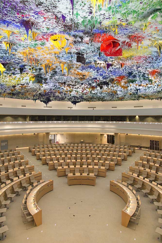 Essa foto do lado é o auditório da ONU. Achei um ambiente imponente com a foto muito bem enquadrada e com um belíssimo teto. Tudo é uma busca por perfeição e por uma forma precisa de fazer.